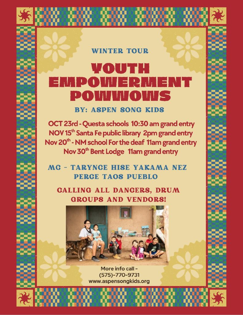 The Aspen Song Kids (Taos Pueblo) will share stories and the symbolism woven into these movements. They will also present from their newest book, Sacred Spiral. Learn how tradition informs regalia and movement hear tales from tradition and immerse yourself in this powerful form of cultural expression.